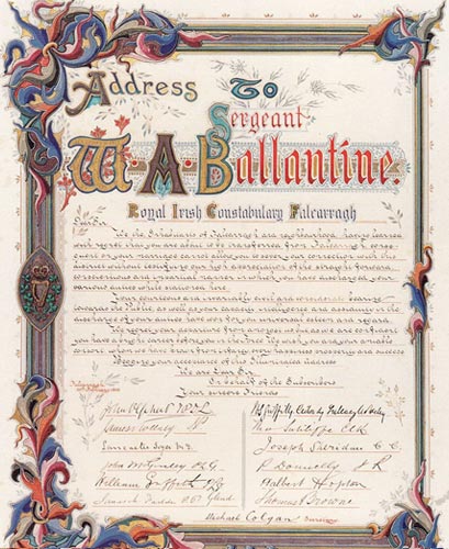 This illuminated address was presented to Sergeant W. A. Ballantine, Royal Irish Constabulary (RIC) on his transfer to another district by members of the local community of Falcarragh in Co. Donegal.